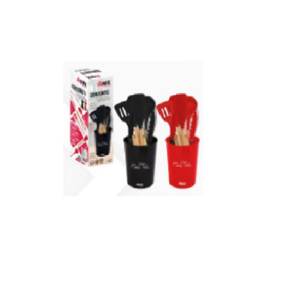 KIT 07 UTENSILIOS SILICONE CABO DE BAMBU PRETO / VERMELHO