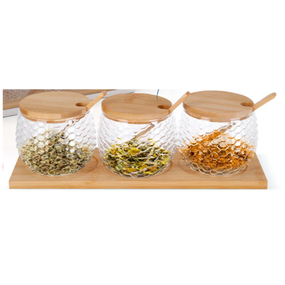 PORTA CONDIMENTO VIDRO C/3-POTE TP+COLHER BAMBU
